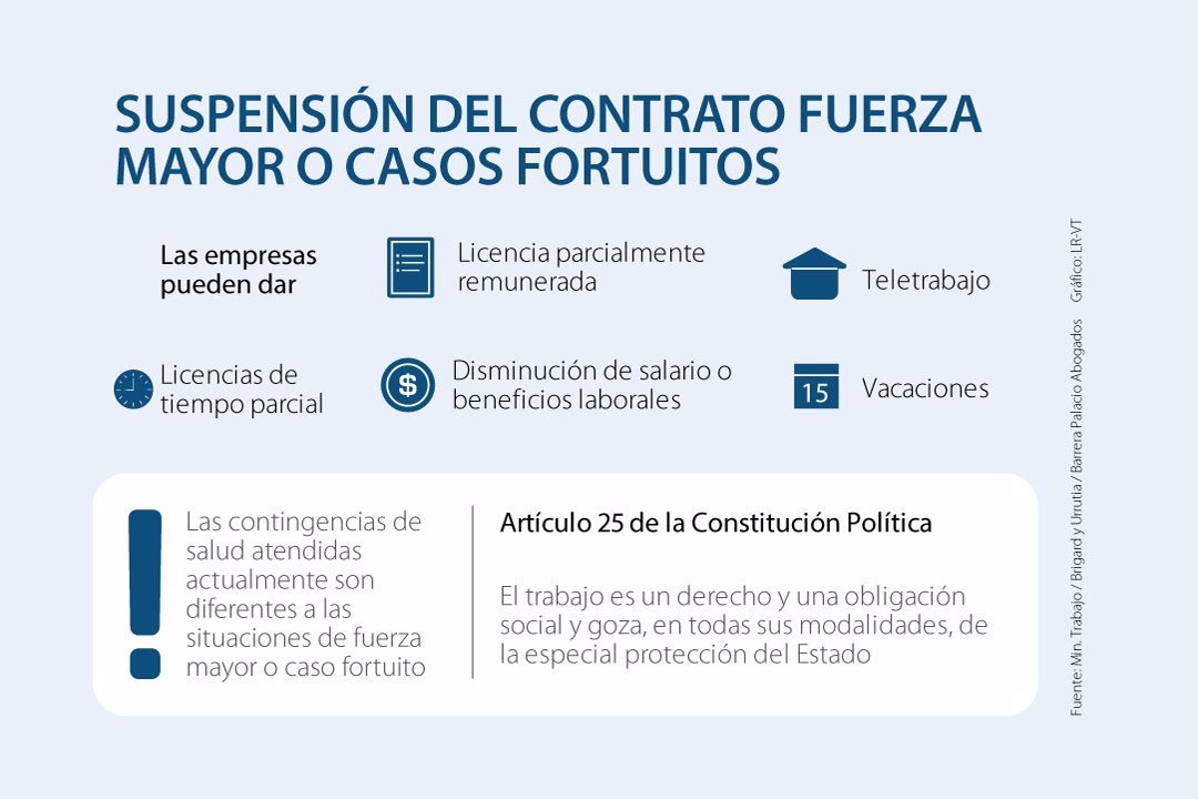 De acuerdo con la abogada Diana Zuleta, directora del Área Laboral de DLA Piper Martínez Beltrán, el Código Civil dispone de lo que se llama fuerza mayor o caso fortuito, es decir, el imprevisto que no es posible resistir. Ahí entrarían cosas como la prestación del servicio militar del trabajador, la suspensión temporal de una empresa o la sanción disciplinaria al empleado, entre otros. (ver gráfico)