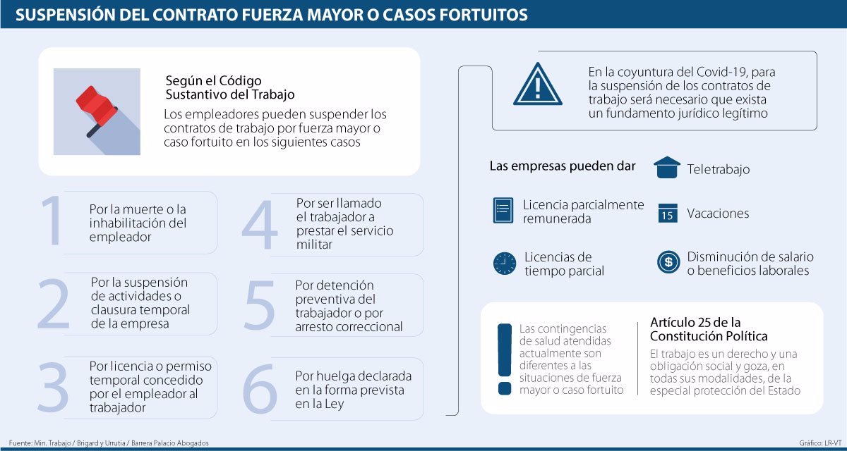 De acuerdo con la abogada Diana Zuleta, directora del Área Laboral de DLA Piper Martínez Beltrán, el Código Civil dispone de lo que se llama fuerza mayor o caso fortuito, es decir, el imprevisto que no es posible resistir. Ahí entrarían cosas como la prestación del servicio militar del trabajador, la suspensión temporal de una empresa o la sanción disciplinaria al empleado, entre otros. (ver gráfico)